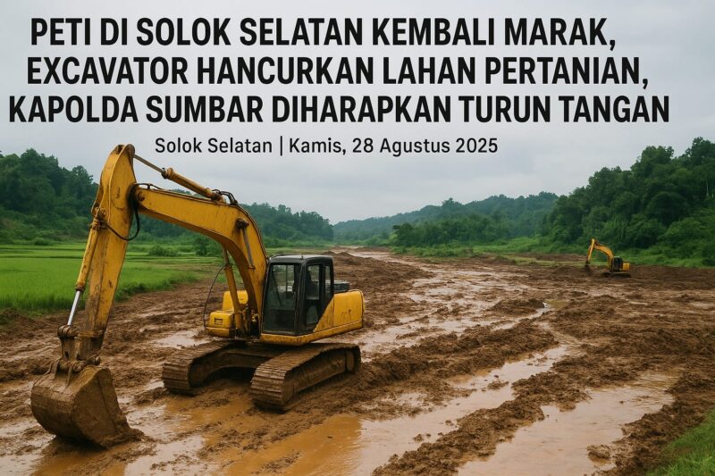 Solok Selatan | Kamis, 28 Agustus 2025 – Aktivitas Penambangan Emas Tanpa Izin (PETI) kembali marak di Kabupaten Solok Selatan. Pantauan di lapangan menunjukkan sejumlah excavator beroperasi bebas di kawasan pertanian milik warga di Jorong Sungai Penuh Lubuk Ulang Aling, Kecamatan Sangir Batang Hari. Lahan yang sebelumnya menjadi sumber pangan masyarakat kini beralih fungsi menjadi tambang emas ilegal.