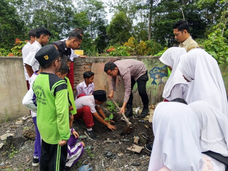 Polsek Hulu Kuantan menggelar kegiatan di SMP Negeri 002 Mudik Ulo dengan memberikan edukasi peduli lingkungan sekaligus menanam bibit pohon alpukat, kopi, dan durian bersama guru dan siswa.