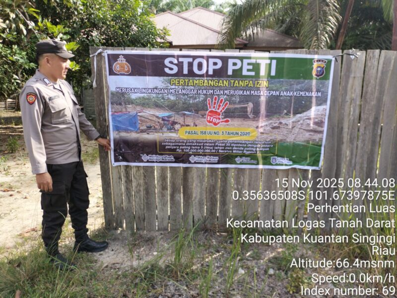 KUANTANSINGINGI,– Polres Kuantan Singingi terus mengoptimalkan upaya pencegahan Pertambangan Tanpa Izin (PETI) melalui pemasangan poster, penyebaran maklumat, dan penyuluhan langsung kepada masyarakat di berbagai wilayah. Kegiatan ini dilaksanakan serentak sebagai bentuk komitmen Polres Kuansing dalam menjaga kelestarian lingkungan serta menekan aktivitas penambangan ilegal yang merusak ekosistem. Sabtu, (15/11/2025)