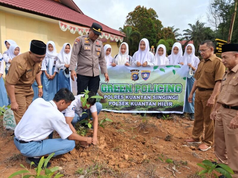 KUANTANSINGINGI,– Dalam rangka mendukung Program Kapolda Riau tentang Green Policing serta menumbuhkan kesadaran generasi muda terhadap pentingnya menjaga kelestarian alam, Polsek Kuantan Tengah Polres Kuantan Singingi melaksanakan kegiatan penyuluhan dan penanaman pohon di SMP Negeri 004 Desa Seberang Taluk Hilir, Kecamatan Kuantan Tengah, Kabupaten Kuantan Singingi, sekira pukul 07.15 WIB hingga 08.15 WIB. Kamis (16/10/2025)