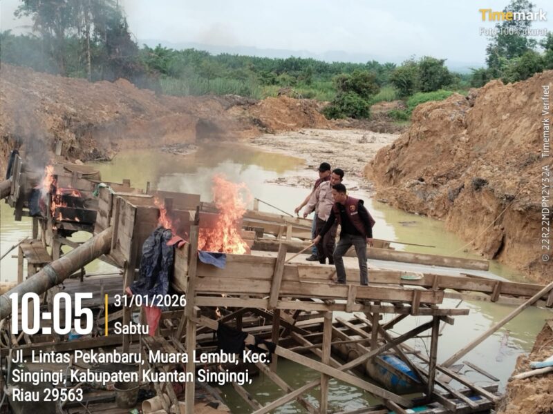 KUANTANSINGINGI,– Kepolisian Resor Kuantan Singingi terus menunjukkan komitmen tegas dalam memberantas aktivitas Penambangan Tanpa Izin (PETI) di wilayah hukumnya, jajaran Polsek Singingi melaksanakan kegiatan penertiban PETI di Kelurahan Muara Lembu, Kecamatan Singingi, Kabupaten Kuantan Singingi. Sabtu pagi, (31/1/2026).