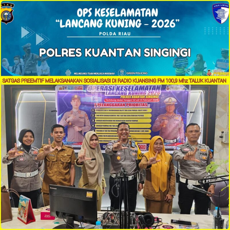 KUANTANSINGINGI,– Dalam rangka meningkatkan kesadaran dan kepatuhan masyarakat terhadap aturan berlalu lintas, Satuan Lalu Lintas (Satlantas) Polres Kuantan Singingi melaksanakan kegiatan sosialisasi Operasi Keselamatan Lancang Kuning 2026 melalui siaran LPPL Radio Kuansing FM 100,9 MHz, Senin (02/02/2026).