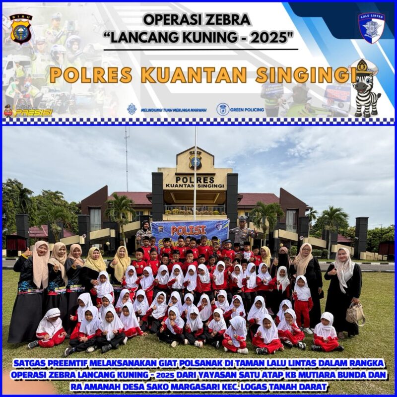 KUANTANSINGINGI,— Satgas Preemtif Satlantas Polres Kuantan Singingi melaksanakan kegiatan Polisi Sahabat Anak (Polsanak) bersama murid Yayasan Satu Atap KB Mutiara Bunda dan RA Amanah Desa Sako Margasari di Taman Lalu Lintas Mapolres Kuansing. Kegiatan yang berlangsung ini merupakan bagian dari rangkaian Operasi Zebra Lancang Kuning 2025, pada pukul 08.30 WIB, Senin (24/11/2025).